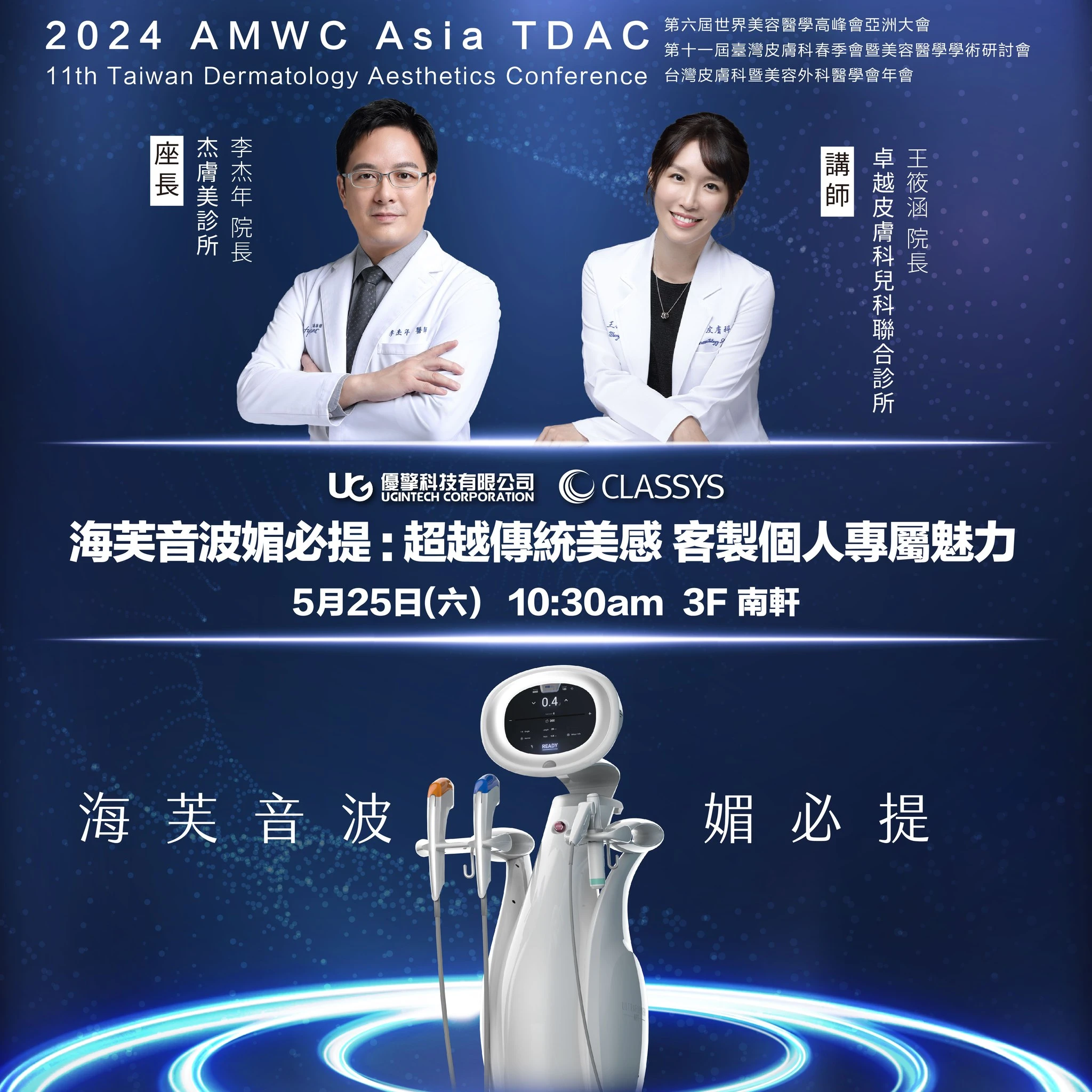 杰膚美皮膚專科診所 李杰年 院長 擔任座長 及 卓越皮膚科兒科聯合診所 王筱涵 院長 擔任講師,將與大家分享海芙音波媚必提的應用。