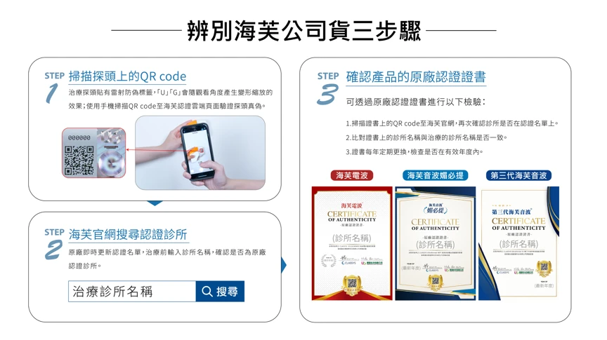 蔡淑臻以實際體驗向外界證明保養不是為了凍齡,而是讓自己在每個年紀都能舒服地看見鏡子裡的模樣。她更提醒粉絲,想要變美,安全才是最重要的!尤其像她愛用的海芙電音雙波療程,治療前記得掃描探頭上的QRcode和指名認證診所更是不能忘記。想確認自己的療程是不是「真海芙」?幾個小步驟幫你安心變美: